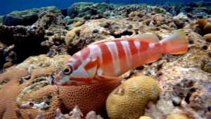 The coloration is variable, ranging from pale greenish-gray to pale reddish-yellow and scarlet. They often have five or six faint dark stripes, the last of which is on the caudal peduncle. The scales on the upper body have a light center and a dark posterior edge, creating a vague checkered pattern. A distinctive feature is the black or dark brown triangular spots at the apex of each hard ray of the dorsal fin. The eyes often have a narrow black rim.
