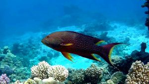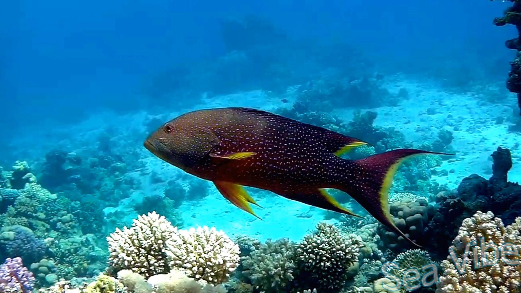 The body is richly colored, ranging from red-orange and crimson to purple-brown. The dorsal and anal fins have pointed posterior tips. The posterior edges of the fins are yellow. Numerous small dots of pink, blue, white, or lavender are evenly distributed over the background.