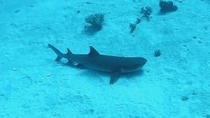 The tips of the fins are painted white. A short and wide head, tubular folds of skin next to the nostrils, oval eyes with vertical pupils. This shark can pump water through its gills and lie motionless on the bottom. During the day they prefer to rest on the bottom and hunt at night. They pose some danger to humans, and cases of attacks, mostly provoked by humans, have been recorded.