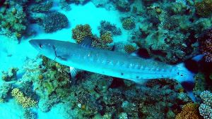 The great barracuda is blue gray above, fading to silvery and chalky-white below. Sometimes, a row of darker crossbars occurs on its upper side, with black blotches on each lower side. The second dorsal fin and the anal and caudal fins range from dark violet to black with white tips.