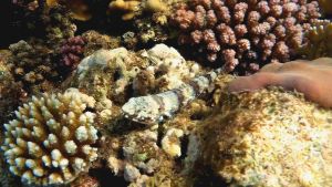 The fish has a reddish-brown mottling on the body, as camouflage, Posterior part of body with blackish blotches. Dorsal, caudal and pelvic fins with dark traverse bands.