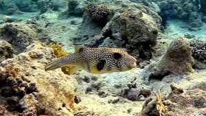 The coloration is grayish, greenish-brown, or gray-blue. The entire body and caudal fin are covered with numerous small white spots. The skin is covered with small but noticeable spines, visible when the fish is inflated. The belly is white. Concentric contrasting white and dark gray lines radiate around the eyes and pectoral fins.