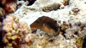 A distinctive coloration feature is light spots on the body and on the lighter belly. There are stripes on the upper part of the body from the mouth to the dorsal fin. Near the dorsal fin, the body is darker, brownish or almost black. Below the dorsal fin, there is a protrusion adorned with a black false eye.