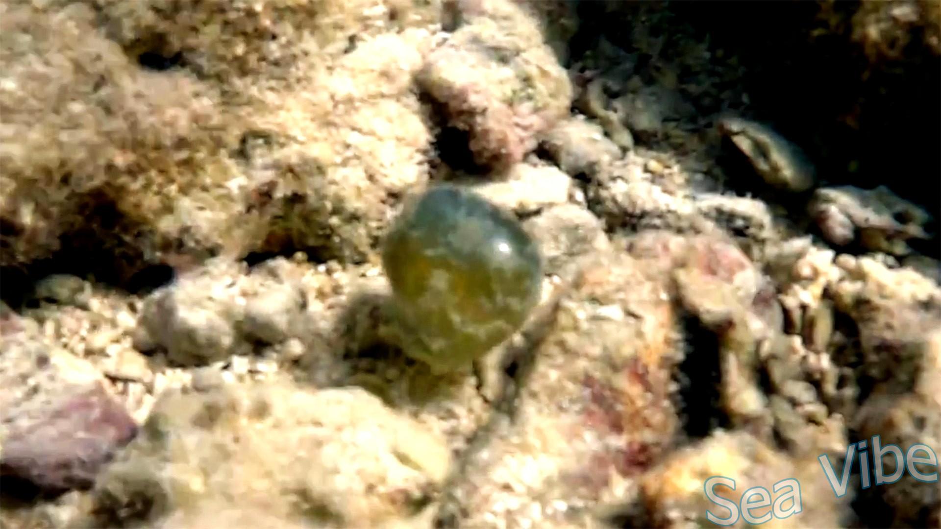 This unique tropical green alga is one of the largest single-celled life forms. It resembles a shiny, water-filled ball or "bubble" (sailor's eye) of a grass-green color, often growing alone, attached to coral substrate. Its surface is glossy, mirror-like, and glassy. Valonia ventricosa is a coenocytic organism consisting of only a single multinucleated cell.