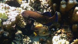 Broom filefish (Amanses scopas) and Bluespotted grouper in Abu Dabbab Bay.