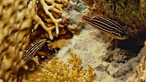 Goldenstriped soapfish and Dusky wrasse juvenile