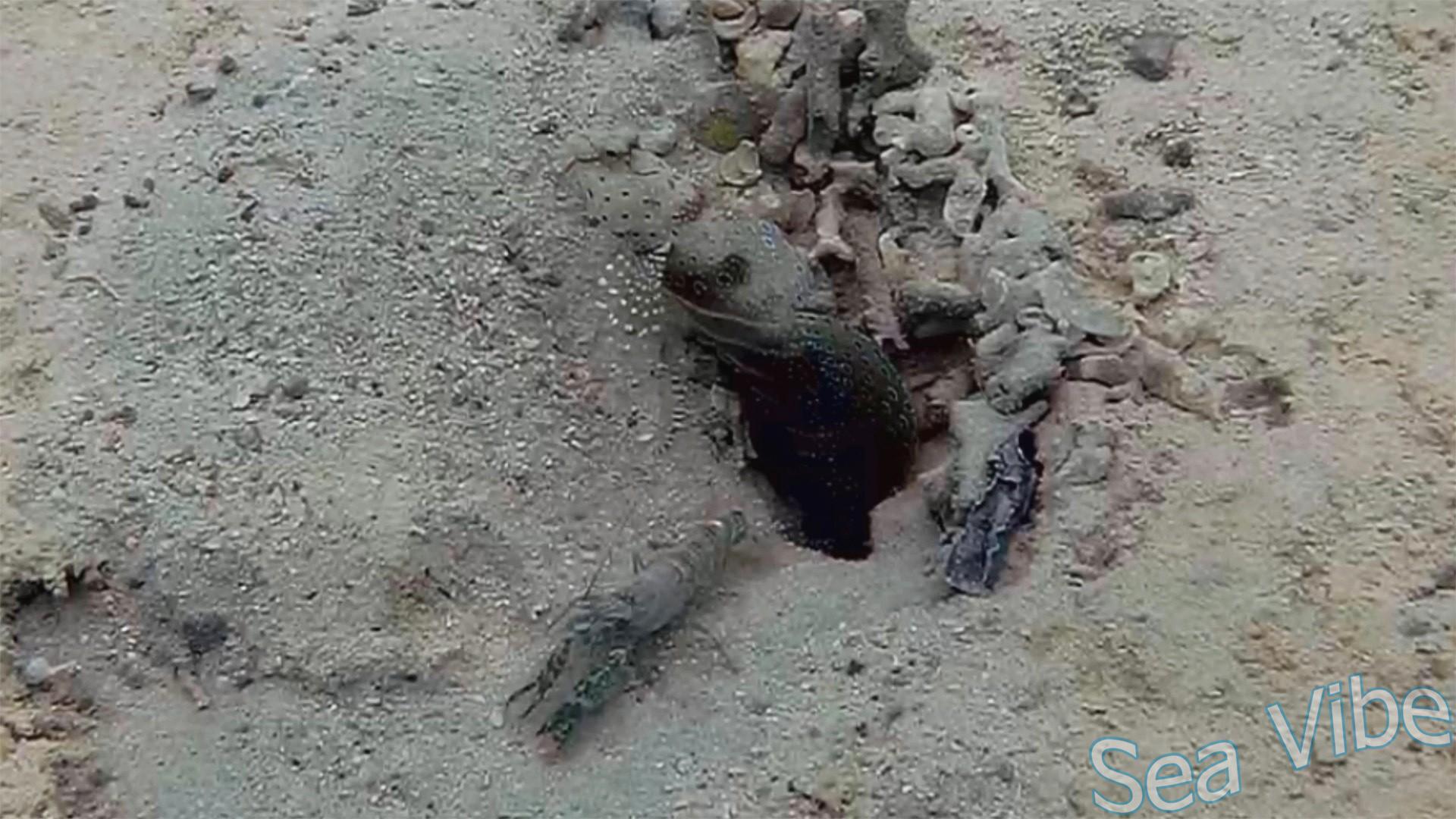 The symbiosis between the Harlequin prawn-goby and the Snapping shrimp is a classic mutualism, where the shrimp builds and cleans a shared burrow in the sand, and the goby, with its excellent eyesight, guards the entrance, warning its visually impaired partner of danger. The Harlequin prawn-goby's overall coloration is characterized by light brown tones. The head is light. Vertical greenish-brown stripes, interspersed with lighter stripes, run across the entire body. Dark brown spots appear on the sides. Pink spots are scattered across the head. There are also blue dots on the head and body. The Djibouti snapping shrimp has greenish-brown stripes on a white background. It is known for its ability to produce a loud snapping sound with its claws.