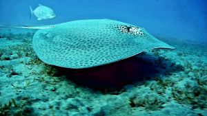 Honeycomb stingray and Orangespotted trevally