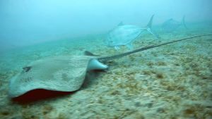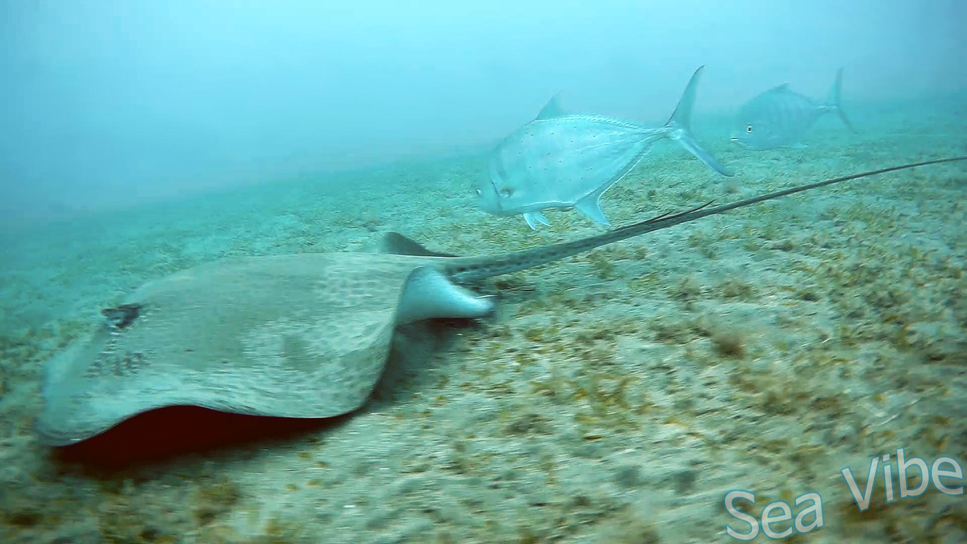 Orangespotted trevally and Honeycomb stingray - swimming together. It is not clear what binds them together.