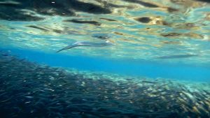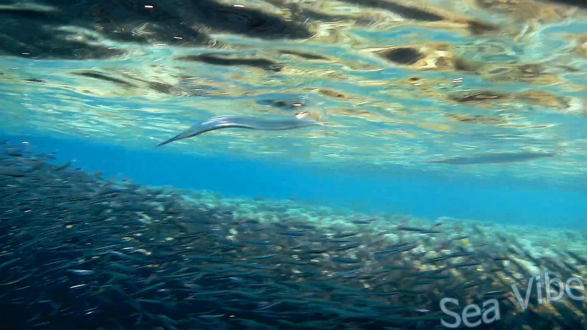Red Sea houndfish (Tylosurus choram) hunting for Hardyhead silverside (Atherinomorus lacunosus).