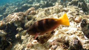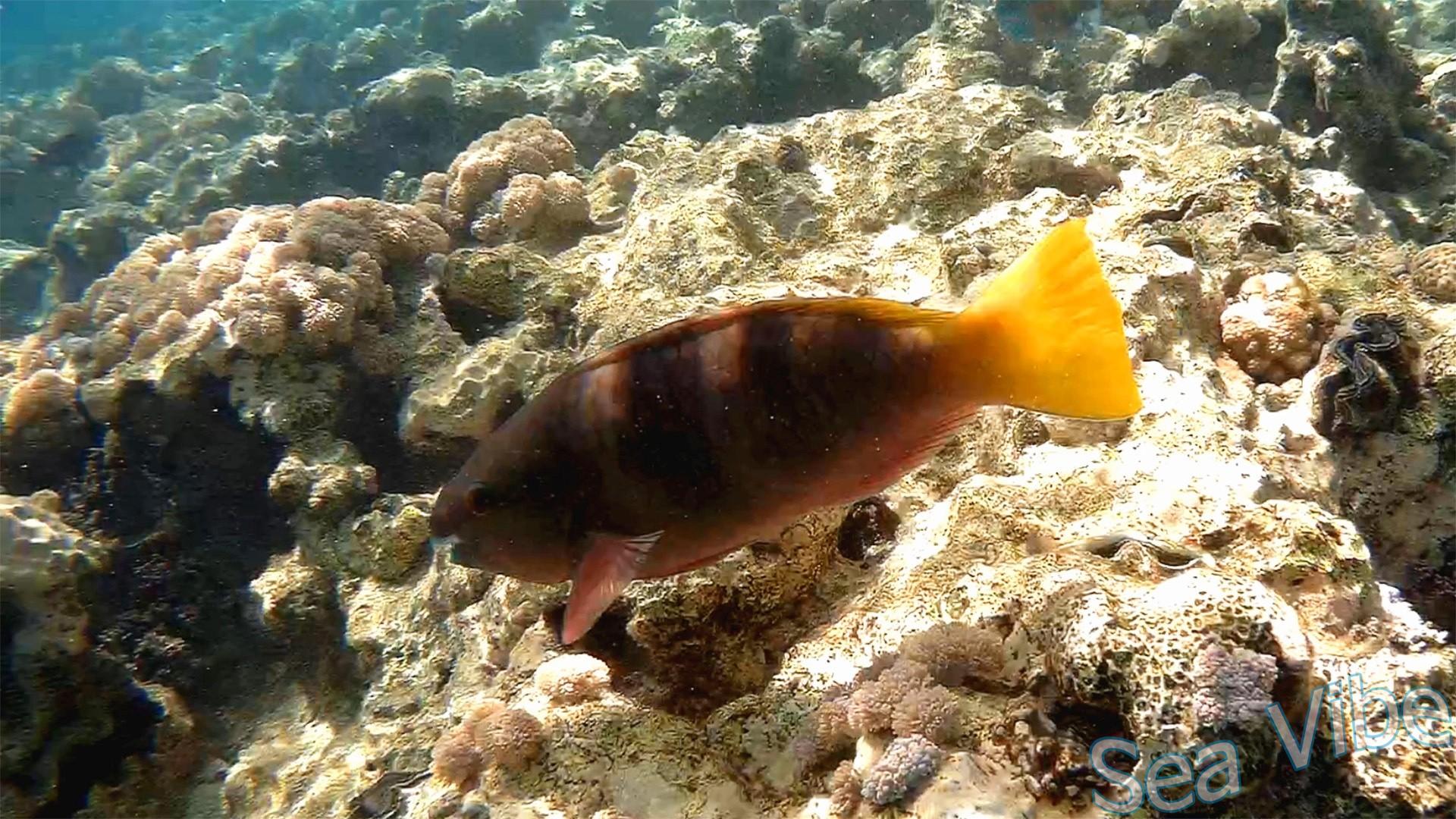 Rusty parrotfish (Scarus ferrugineus) female differs from the male in its more modest coloring: her body is usually brownish-red, often with longitudinal light stripes, while the head may be lighter. Characteristic features include small tail feathers, a white spot in the corner of the mouth; the back of the dorsal and caudal fins is yellow.