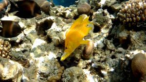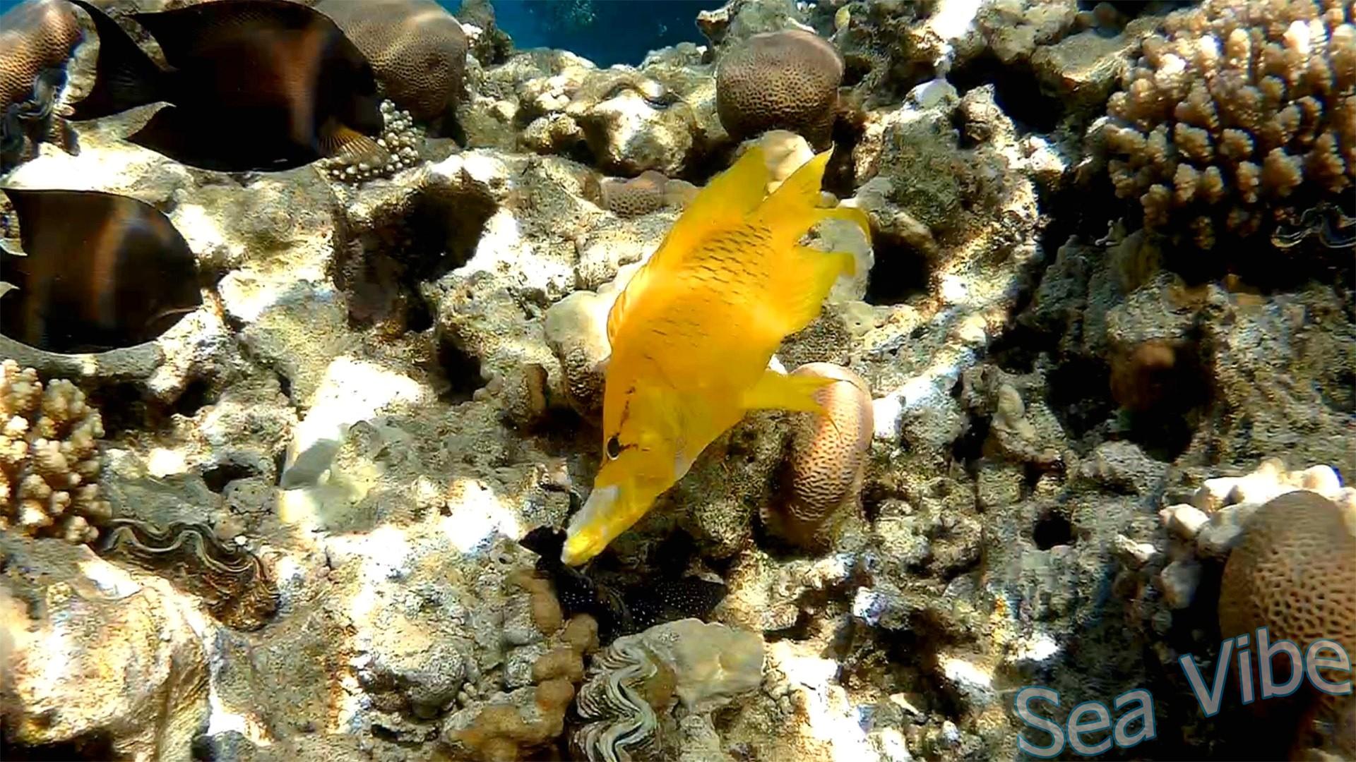 Slingjaw wrasse (Epibulus insidiator) attacks Bluespotted grouper (Cephalopholis argus) in the Ras Um Sid Bay of the Red Sea.